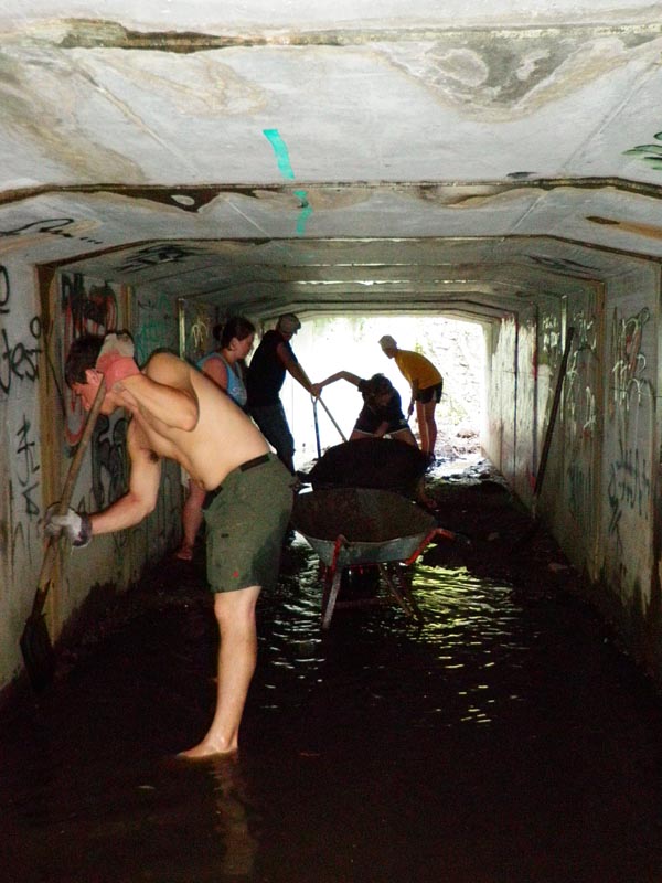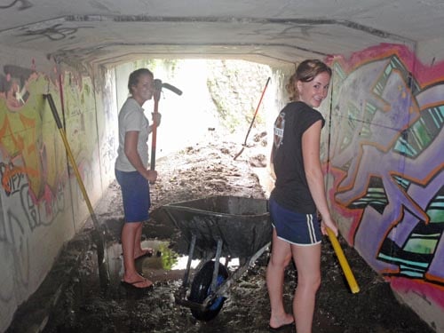 Image this: You jump down into a cement ditch and crawl through a long, dark tunnel. Once through you come to another dark tunnel -except this one is filled with mud, rocks and scum up to your shins. There are HUGE spiders everywhere, who- knows-what creepy crawly critters in the water/gook you are standing in, and lizards running around. Now you are given shovels, a wheelbarrow and a pick-ax and told that you are going to clear out EVERYTHING —What do you do?