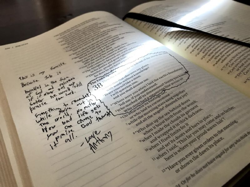 Next to it, he’d written: “This is my favorite because Job is humbled in the face of God and realizes that if it never gets any better he will still praise the Lord. Something to remember while you’re out in the world. No matter how bad life gets you can choose to praise God through it all.”