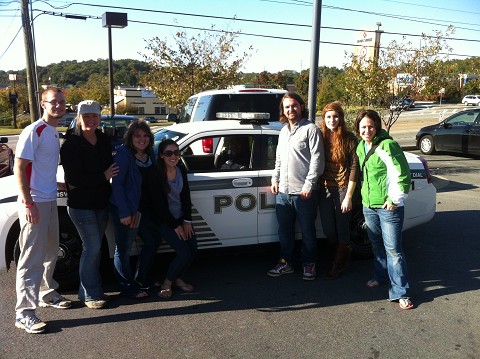 Hugh- gets back from chaecking on the girls and informs me that they found some women to talk to inside Starbucks. So- I started to calm down and realize- that God was using us and started to see that God was working. So shortly after the girls comeback outside and officer Shaw asked us if we were all together. And that opened up the floor to tell him about The World Race and what we doing in GA. We then took pictures with him infront of his cruiser! And He couldn't stop smiling! he loved us! 😉