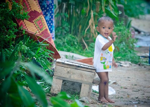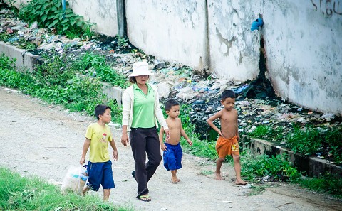 (Carrying their collected plastic bottles along the riverside. The children have no shoes on. And raw sewage is pouring from the pipe.)