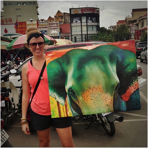 First was with a painting that I was really excited about, and knew that it was something I would keep forever and tell the story about how it came to be. I took a photograph of this elephant in Chiang Mai, Thailand.. and two months later in Cambodia I came across a booth in the market selling beautiful canvas paintings.. I told my teammate that the paintings were exactly the look that I had envisioned getting done of my photograph once I got home, to put in my house someday. I thought it was probably crazy to ask the lady if she could paint it for me.. thinking she probably didn't even know the artist, or if she did she would charge me a lot extra for a custom one. I showed her the picture of the photo on my phone and asked her if she knew the artist and if she could paint it for me. She studied the photo for a few minutes, and said 'Yes, my sister paint. Large canvas $30. Please bring me copy.' I got super excited and so did my teammates who were with me. We went on a search around the city for a copy shop that could print a photo off of my phone. We found one and got the photo printed and took it back to her, she said to come back in 5 days and my painting would be ready. When I returned 5 days later she had to call the artist to bring it to the market because she was still working on it and the paint was still wet. She had spent all 5 days working on it and she was very proud of her work. It is beautiful, and looks exactly like the photograph!