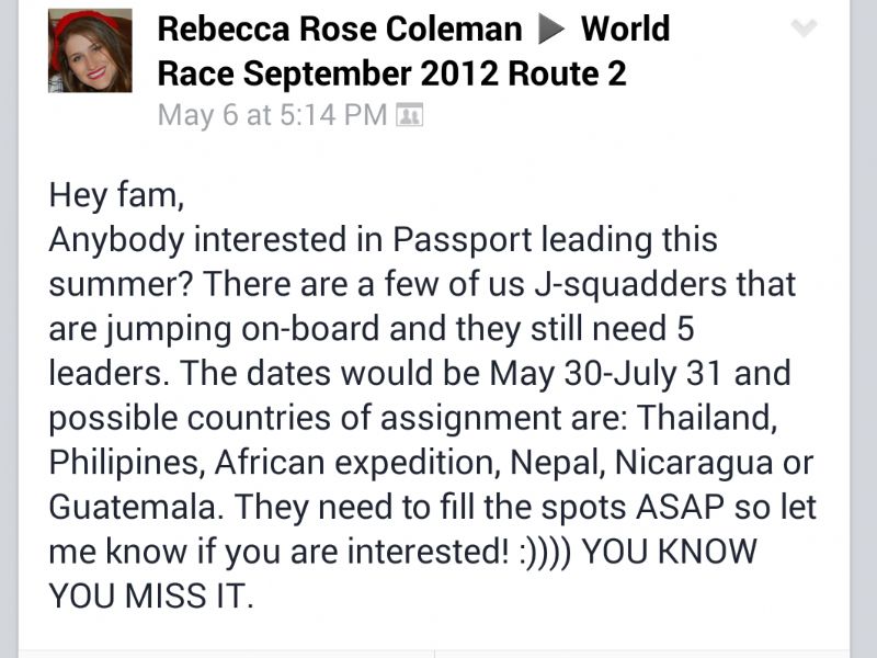 Then I began praying about it and asked some friends to pray for me. Honestly, I didnt get a Yes or No or any overwhelming Holy Spirit chill through my body. But what did keep coming to mind was that all the things I was concerned about (timing, money, readiness, etc), it all involved my own ability to take care of these things. I just kept remembering all the crazy ways God had perfectly taken care of everything I needed before and during the World Race and even after the race to this current point.