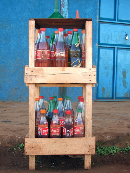 Usually driving to town someone would come running to the side of the road with gasoline to fill up the taxi- this is how they measured it..coke bottles!