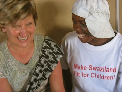 (Karen Barnes with one of the girls at the community center. On the back her shirt said “Stop Child Trafficking.”)