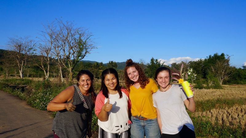 At this point, our walk had turned into exploring our new home and we had given up the hunt for this woman in pink. Our squad leader, Kristen, saw a random neighborhood road that looked intriguing so we ventured up. On this neighborhood road, we met a lady who spoke some English and was holding a baby in a fedora (win, win). As it turned out, a teacher from the school we are working at lived right next door. In usual Thai fashion, we were led to her front door. She came outside with her son and… she was wearing pink. She asked where we were walking and then offered to walk us to her family’s… rice field.