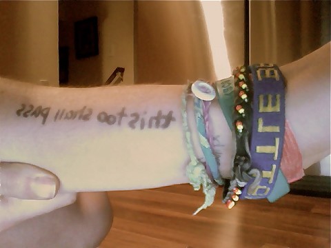 When I first got home, my sister and cousin and I went to my grandmother's, and on another early morning not unlike this one, I wrote "this too shall pass" on my arm in permanent marker. Lexie called me out on it, asking why I'd put something so grim and morbid on my body.