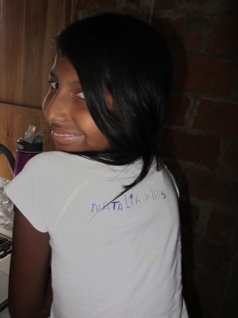 Everyday that I saw her, it was the same. The same smile, the same eyes that spoke things I can't explain. The same grace. She went to a couple house visits with our team and clung to me. She sang out like it was the last time she would be able to sing and the smile never left her face. She sat by me in church and was so eager to hold my purse for me, and read along with me in my Bible, even though she had no clue what it said. One day in church she asked for some of my paper. I gave it to her and she made me this. Closer to the end of our time there, she came with her mom to help cook lunch for us, and on the back of her shirt she had written "natalia y iris, amigas para siempre."