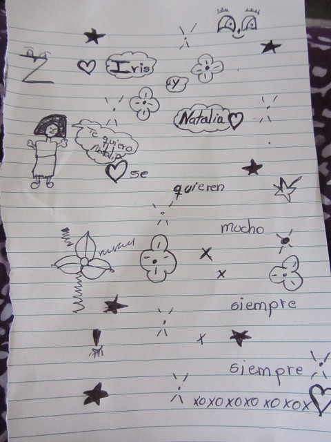 Everyday that I saw her, it was the same. The same smile, the same eyes that spoke things I can't explain. The same grace. She went to a couple house visits with our team and clung to me. She sang out like it was the last time she would be able to sing and the smile never left her face. She sat by me in church and was so eager to hold my purse for me, and read along with me in my Bible, even though she had no clue what it said. One day in church she asked for some of my paper. I gave it to her and she made me this. Closer to the end of our time there, she came with her mom to help cook lunch for us, and on the back of her shirt she had written "natalia y iris, amigas para siempre."