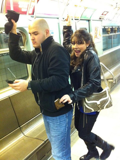 Brittany 'pickpocketing' Nathan on the subway, haha. 🙂
