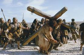 exposed flesh carrying a wooden cross too heavy for Him to bear.