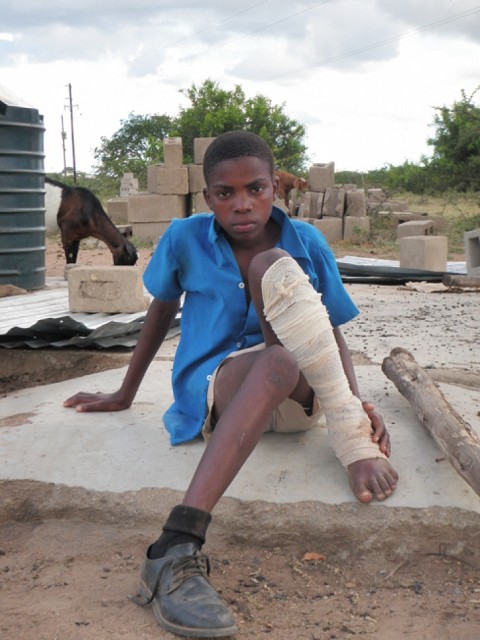 We had just pulled into the carepoint in Thulwani. The kids gathered around the big tree to welcome our arrival. I noticed a boy sitting on a concrete slab all by himself. His leg looked bandaged up. I immediately went over to him and with the help of our translator I ask what was wrong. Apparently three days ago he had fallen off the back of a motorcycle and was dragged some how. I could see the blood oozing through his bandage while flies buzzed busily around it.