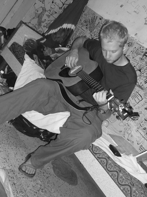 Playing the guitar in the Hostel. It cost less than 2 dollars a night to stay here.