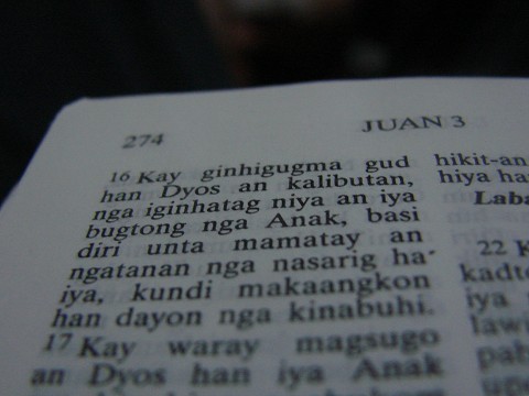 This is John 3:16 in Waray, the language of the people that I’m currently ministering to in the Philippines.  Many Americans forget about the world because we have so many material possessions to keep us occupied.  God loves all people, even the one’s that it takes five planes, two vans, three boats, and a few miles of hiking to get to.  Just the other day, I had the incredible priviledge of sharing the story of the prodigal son with a dozen people who had NEVER heard it.  Only one of them had ever held a Bible!  Jesus says in Matthew 9:37, ” The harvest is plentiful, but the workers are few.”  God loved you, me, and everyone else so much that He sent His Son to die for us.  What have we done for Him?