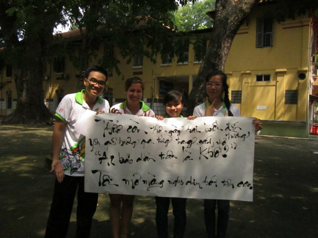 5. At a random high school, I had to memorize a poem in English, run it over to 2 of my teammates who translated it into Vietnamese and our last teammate wrote it in calligraphy. Just look and see how beautiful it is…