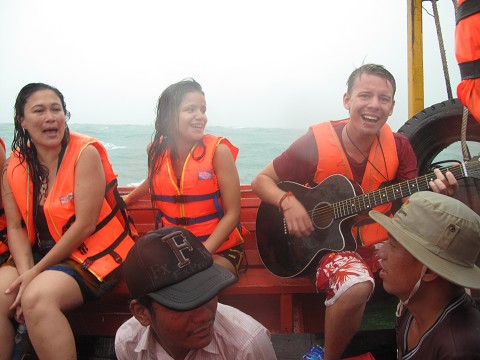 Thunderstorm (lightning and thunder), black skies, pounding rain, (big, cold, cutting rain), in seas of about 15 foot rollers…all in a rickety little Cambodian boat with a weed-eater motor put-putting us along through the storm, there is not top to this boat either. A guy from Switzerland pulls out a black guitar in the midst of everyone hanging on for dear life or over the edge puking, and starts playing Bob Marley! So hilarious. Why he brought his guitar on the boat, I’m not too sure, but it sure was funny.