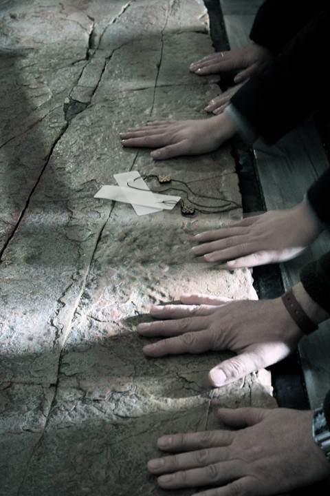 [Hands of people praying on the stone of anointing at the Church of the Holy Sepulchre in Jerusalem.]