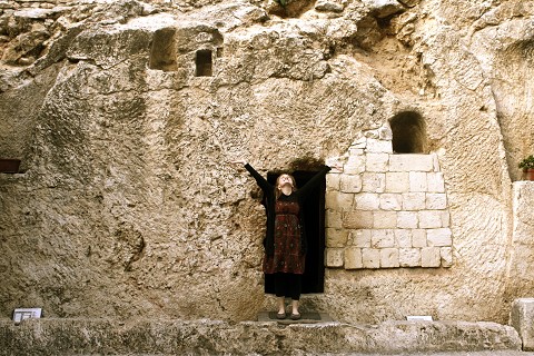 [Standing in front of the empty tomb at the Garden Tomb, ‘He is not here for He has risen!’]