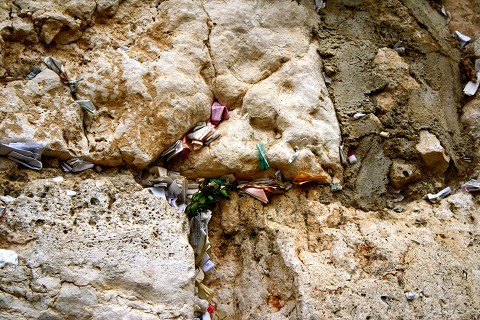 [Notes of written prayers are places in every crack and crevice at the Wailing Wall.]