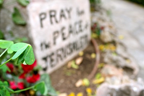 [Sign in the Garden Tomb in Jerusalem, it reads: Pray for Peace in Jerusalem.]