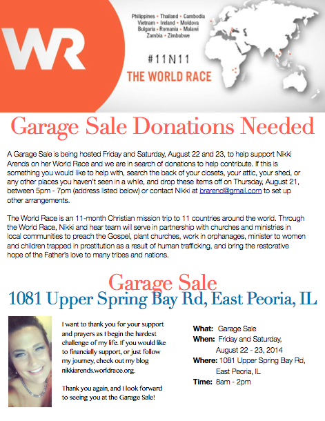 I am searching for donations to put in the garage sale; I will take anything you are trying to get rid of, or forgot you even had because you haven’t seen it in so long. 🙂 Check out the flyer for more information and let me know if you have any questions!