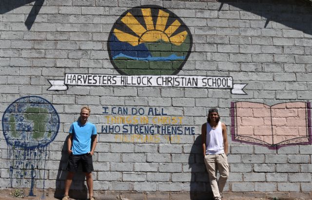 Our final week and a half of ministry was very interesting. We started off by digging 6 foot trenches for foundation from scratch. This was very grueling work, and I ended up hitting several large boulders too large to move while picking at the ground. After two days, some of us split off to go paint the school of the church that our pastor worked at. The principal gave us full creative ability to paint this wall. Our idea of what we were going to paint changed daily. Diego and I were the main painters on our wall, while Mike, Lucas and Rye worked on the other wall. The first day all we did was paint the wall a grey color to make it easier to paint on concrete bricks. The second day, the principal asked us to write a verse, Philippians 4:13 (the school’s bible verse) on our wall. After we finished painting the verse, Diego got the idea to paint a globe next to the verse, since we had a lot of green and blue paint. But, we wanted to do something CRAZY, so we painted the globe with our hands. It was very hard to make the paint stick with our hands, so I smeared it with my palms most of the time. After we had almost finished, Diego kicked the bucket of blue paint and it spilled down eh wall below the globe in a huge blob. Instead of freaking out, Diego suggested we make it a dripping globe, and we proceeded to spill more paint and splatter paint the underside of the globe. The next day Jack painted a bible on the other side of the verse, as Diego and I got started on the school logo , directly above the verse. The school logo was an oval with the sunrise over the mountains, and underneath was the schools name: Harvesters Hillock Christian School. The oval did not turn out the greatest, but Diego made a beautiful interpretation of the sunrise. We also changed the mountains, to make it look like a river was flowing through it, and contrasted the grey and blue at the top leading to the sun. I ended up writing the name of the school, but struggled. The spacing was almost impossible to make even, and I had to redo the words twice. The third time I marked out with tape where every letter would go. It took 3 hours, but I finished the logo and it looked pretty cool.