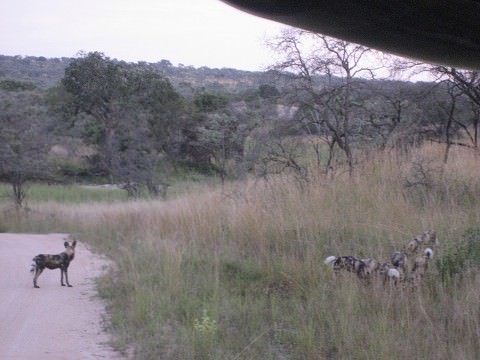 a very rare sighting of wild dogs, at a kill