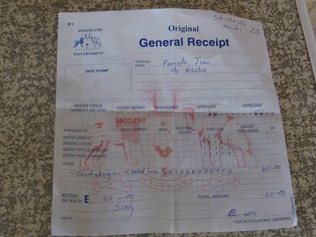 yself talking to a policewoman who was essentially giving me the information I already knew, that I would need to go to court. When I informed her that there was no way I was going to do that, she pulled out her Swazi traffic rules book to prove to me that what I had done was illegal. I had to explain to her that I in no way doubted that what I did was wrong, but that we would need to come up with another solution of how to take care of this (I had no idea trying to bribe Swazi police officers would be so hard). She then made a quick phone call and told me it would be a 60 rand fine (less than $10). Hello! That is much easier then court. So, I ran back across the street to the van and quickly got the money while she wrote out my ticket (which by the way she wrote my name down as Pamela Jean, my first and middle name, and in no way included my last name). I then handed her the money, took back my license, and got back on the road.