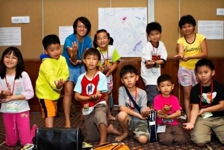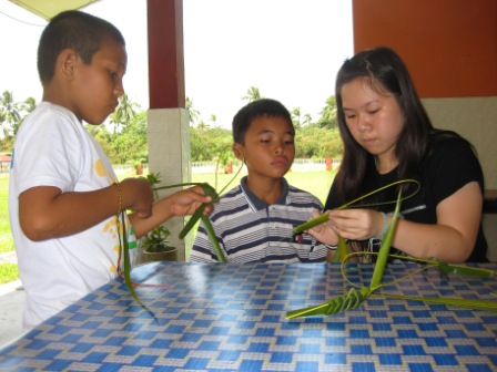 Teaching the local kids how to make grasshoppers out of coconut leaves.