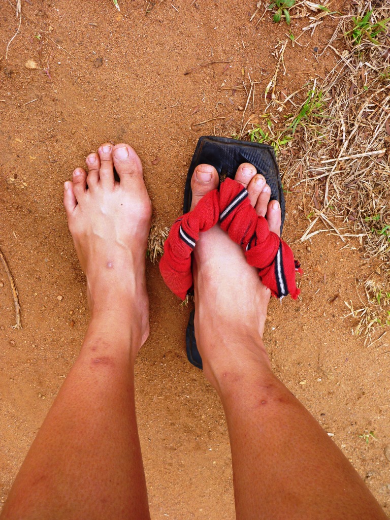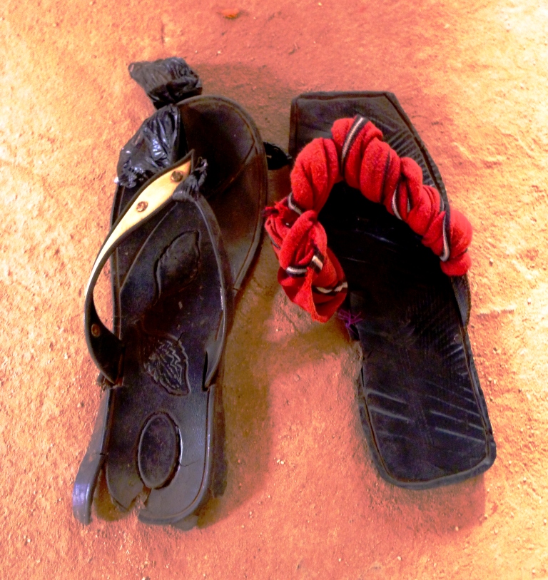 Shoe #1: As we were walking, Christi-An kept praying “Lord, please give us a shoe.” At the bottom of the hill, we found one broken tyre sandal. We stuck a safety pin through it to keep it together, and then I found a piece of cloth so I wound it around the shoe to make it more comfortable. Doesn’t it look like a Japanese slipper?