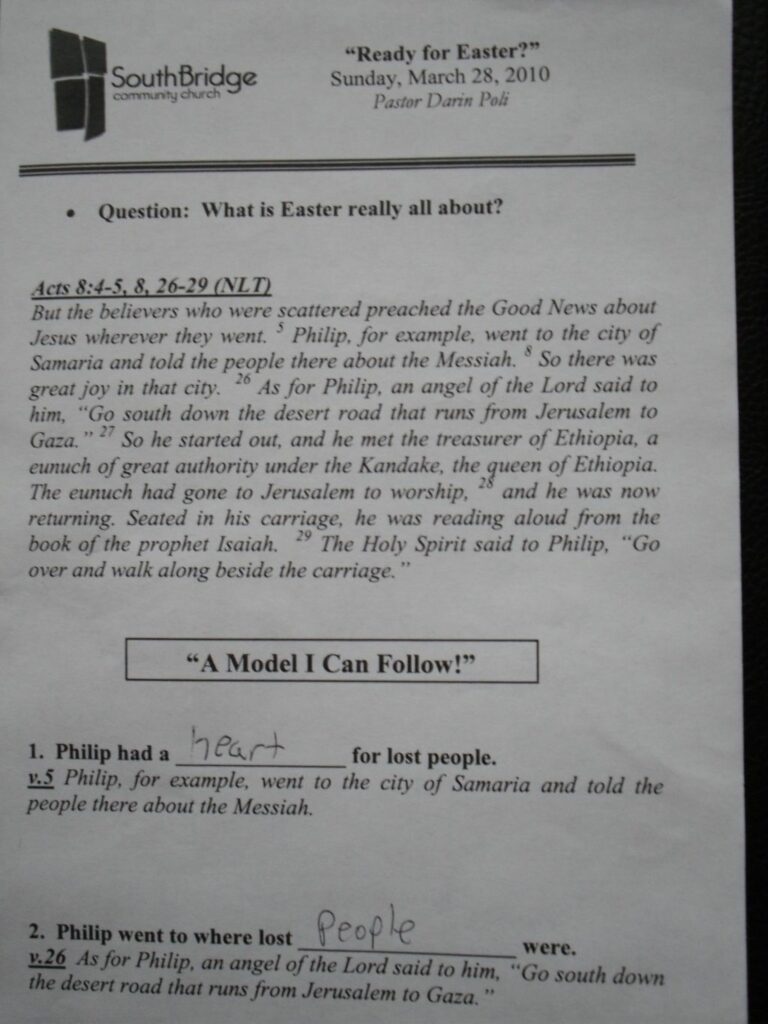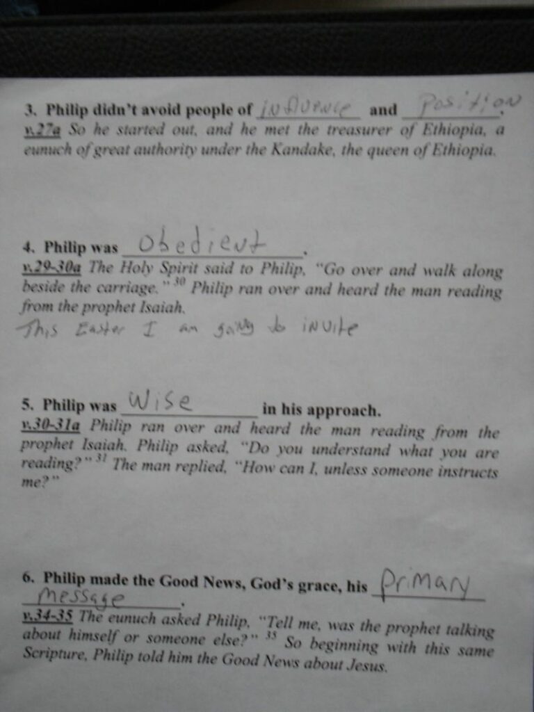 Lastly, today, Palm Sunday service was the icing on the cake. Today’s message was about PHILIP. I opened up the bulletin to look at the notes and up and down both pages were bullets and scriptures about PHILIP. Whaaaaaaaaaat!?! I seriously started to tear up! And as Rachel was telling Jenny the story on the phone all I heard was-“Today’s message was about PHILIP. Phil almost peed his pants, infact, I think he did a little.” π I always knew growing up that my Grandma named me after the person PHILIP in the Bible. I never really looked up who PHILIP was, but I just figured he was a cool dude. I’m not sure where the extra “L” in my name came from, but maybe it was just a special touch. π Well today I got a crash course on who PHILIP was. Again, God sent me a message. Thank you Lord! Everything that was mentioned about PHILIP tied into The World Race somehow. Take a look at the notes for today: