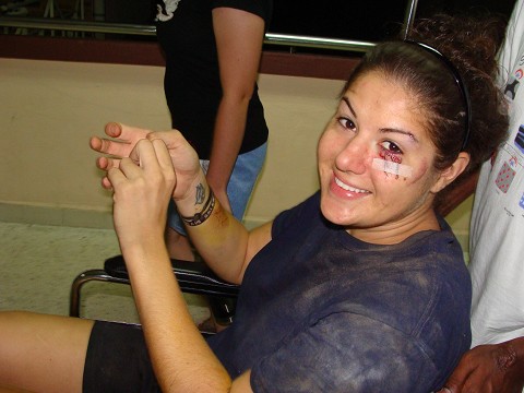 The plastic surgen came in and decided to take me to another room. I was happy to get out of the chaos. Ron followed and ended up hanging out the rest of the night. I was only allowed one person with me so Darci was with me at first and then lucky little Di got to be with me for stitches. My cuts were really dirty so Dewa (surgen) had to clean them out. The ones by my eye weren’t super deep, but the one on my left elbow was. That gash is/was about 1/4″ deep by an inch long, pretty gross.