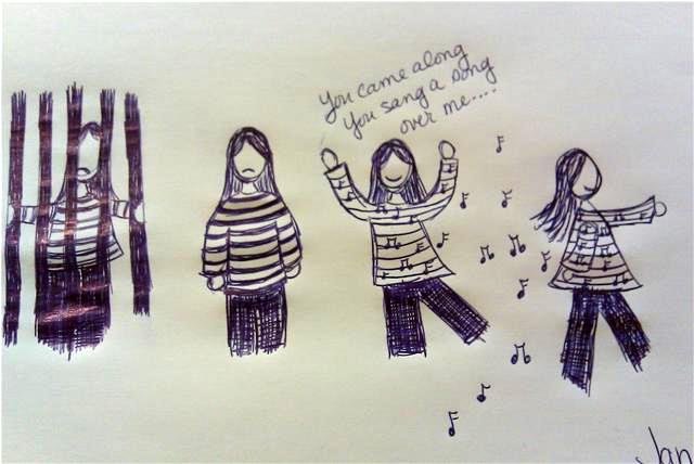 What He showed me was when He sang this song over me… the thin black and white stripes of the prision shirt shrank the stripes and into music frets that were filled with notes.