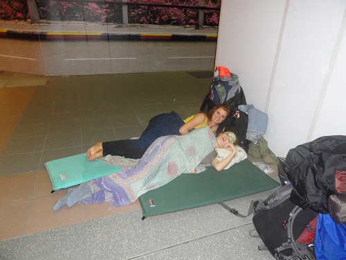 To save money we slept on the floor in the Singapore airport-little did we know the wall behind us contained construction equipment that would be used above our heads all night-thank God for ear plugs!