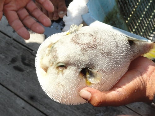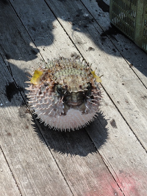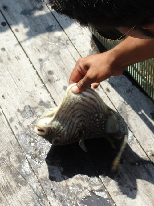 They stopped at a floating fish farm and showed us the latest catch :o) Puffer fish!