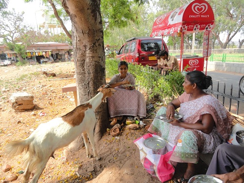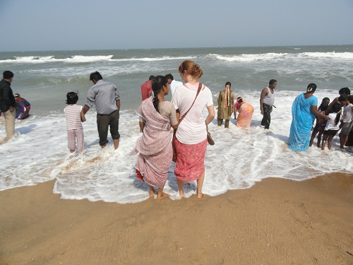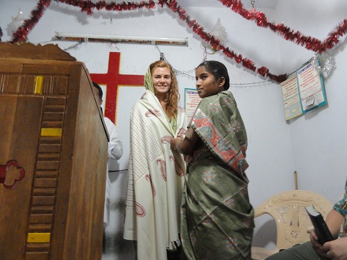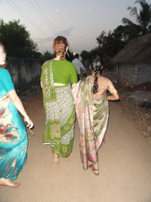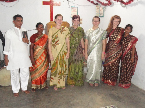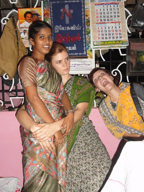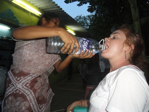 From the moment we stepped foot in Chennai, India (I mean the moment we stepped off the train), we’ve been served. We were greeted by Pastor and his family. Imagine these people practically fighting to carry our 50 pound packs, daypacks and anything else. Our team currently lives with our contact-Pastor Devadhas, his two sons Lijo (27), Leo (22), and a young woman (21) who is a member of the church (which is in the same house-just a big room) named Glori. Glori (Manchu is her Indian name) was apparhently hired to cook for us and serve us the entire time, along with another woman named Lima who lives with her husband somewhere else. I have never met anyone like Glori, her servant’s heart goes far beond what she was “asked” to do for us. I wish I had a video to show you what I mean, before a thought crosses our minds of something we may want, she is already bringing it to us. She cooks pretty much all the time-in the 100+degree heat for us, our meals aren’t basic, we’ve probably had every type of bread India has to offer and the sauces and fruit are delicious too. She brings us water, coffee, carries our bags (and she’s TINY!), and all this without a word of complaint. Glori is also a person that you can’t argue with, she comes and asks you if you want more and before you can say no, it’s aleady on your plate. We have offered to help and this is absolutely refused. We have finally learned to say no to the extra food because most of what we eat is starch or carb and very filling. She barely speaks English, but the joy in her heart from serving is evident and contagious. She loves Jesus with everything inside her and it has been an absolute honor to get to know her. We also have to wear Saris to evening ministry and she dresses us Tuesday through Saturday in these and it’s not an easy procedure-Indians are immaculate folders! I have found that wearing a Sari here is like wearing a prom dress on a hike in the desert! I hope to become like her one day-serving everyone around me almost subconsciously and with complete joy. We barely do anything for ourselves! As you can even see in the picture below of her pouring water into my mouth…haha, I love you Glori!) Ah-in-bin (I love you in Tamil)-not spelled correctly :o) Thank You Jesus for Your precious servant! We will never forget her!