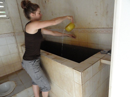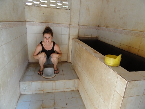 Definitely glad that I’m not a planner…last month our team was told we would be working in 2 different centers with orphans…as of today (2/8), our team arrived in the village we will be staying in for the month, it’s called Kongtaneang, Cambodia. We will be teaching English once again Monday through Friday, however the difference this month is that the children we are working with are too poor to attend school and so the pastor at the local church teaches a small group in the village for free (to the ones who don’t already attend school), the ones who are able to attend school pay a small fee. The conditions here are a little tougher than Thailand, to say the least (not that Thailand was that tough-condition wise-we had regular toilets, showers that were cold, but still showers, awesome food, and a warm family to stay with-also no humidity:o), here there is no running water, no internet, and electricity from only 7-10 at night and very high humidity with no fans or anything at night. The water here that we are able to use for bathing (bucket showers) is not very sanitary either…so pray for our team as a whole to remain healthy and patient :o). Cambodia is also a very dark place-spiritually, the 2% in the title of this blog represents the amount of Christians that live here, I am grateful that I am now a part of it. Another thing that blows my mind is we are the first Americans to visit this village and thus the first “white people” these people have seen, the kids just stare at us and smile…I wonder if this is what celebrities feel like all the time??? At our debrief at the beginning of this month we were told a bit of the history of Cambodia and how heart breaking it is…more than 30 years of war and killing…many times-innocent people. Once again I had in my mind that we would be working with orphans (something I REALLY want to do!), but once again God had a different plan in mind and His ways are not ours, but His ways are always the BEST for us. As you can see below, we will be using “squatty potties”, something I am finally getting the hang of (these are used throughout most of Asia), they also don’t use toilet paper, but some bathrooms have these little sprayers to use instead…whew!