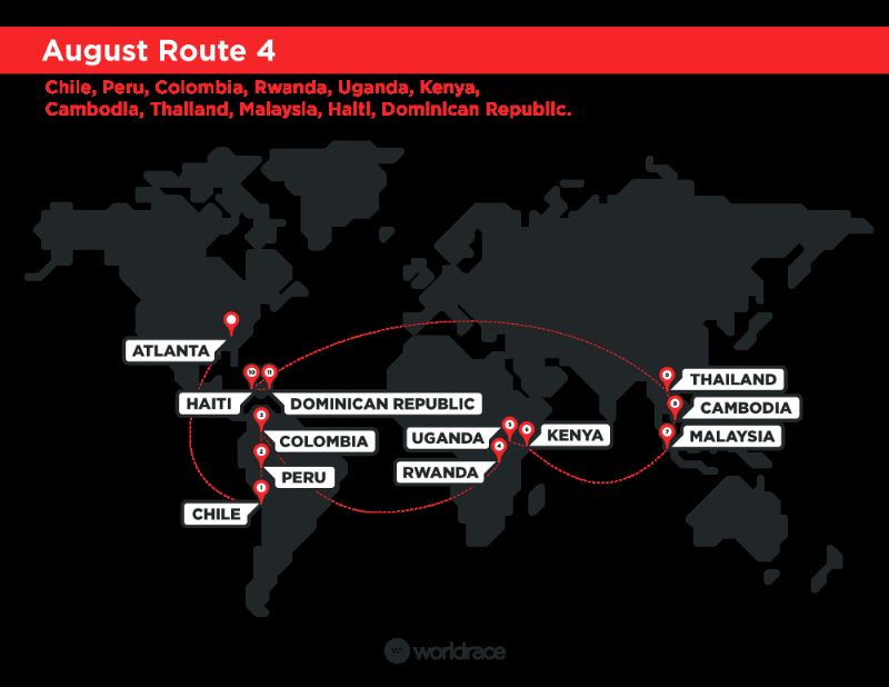 So when the route came out last week and I saw the countries it was going to, I honestly did not think it could be true. Route 4 of the World Race, leaving August 2018 goes to Chile, Peru, Colombia, Rwanda, Uganda, Kenya, Cambodia, Thailand, Malaysia, Haiti, Dominican Republic.