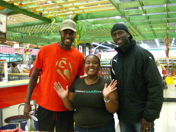 So today Lili and I went shopping for the weeks groceries, just the two of us. We hit the meat isle and then searched for tomato sauce that wasn’t ketchup. We got cereal and eggs and oatmeal and canned fruit, then we came to the produce isle. I was trying unsuccessfully to reach the top shelf where the purple grapes sat taunting me (everyone on our team is 5’4″ or under) when out of the corner of my eye I saw them, the futbol players. I stopped my reaching and turned to Lili excitedly (they were behind her) and said “they’re here”. She turned to look and by then the first player was very close I asked “do you speak English”, I don’t know why I assumed that being black, they would speak English but that was my assumption and the true source of my excitement. He didn’t speak English but gestured to the second player, in the red jacket, who I then addressed. Turns out they are from Brazil and didn’t seem half as excited to see us as we were to see them, we took pictures with them like tourist and I spent the day telling our team and random acquaintances “look what we found” and showing them the pictures.