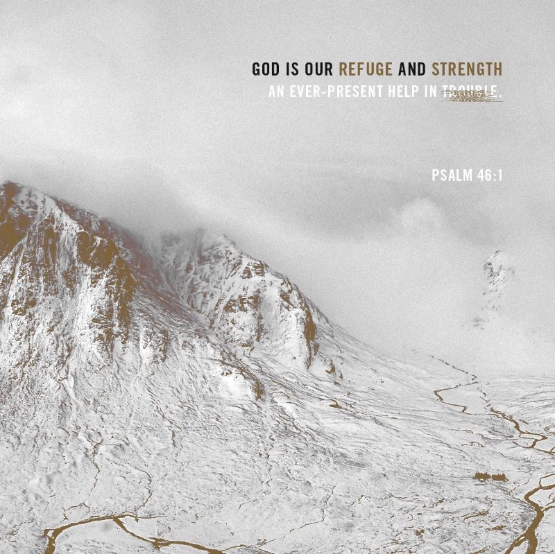 “God is a safe place to hide, ready to help when we need him. We stand fearless at the cliff-edge of doom, courageous in seastorm and earthquake, Before the rush and roar of oceans, the tremors that shift mountains. Jacob-wrestling God fights for us, GOD -of-Angel-Armies protects us.”