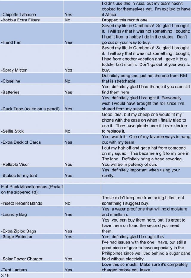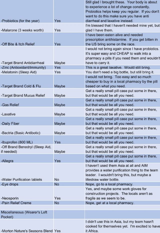 I had a couple of World Race alumni help me pack my bag for the Race on two separate occasions before I left. One of the things I struggled to wrap my mind around was letting go of the brand names of my toiletries. So what I did, and it worked out great, was I brought the travel size of my toiletries and as I was able to find my brands on the race I bought more. In other circumstances, I lost my favorite face soap down the drain month one and I’ve had to get used to using what I could find and praying to God that I don’t break out. The point is, you will find many of the brands and things you love in many of the countries you travel to, but if you don’t find them you won’t die either. So pack light because you will be carrying your life on your back for the next year and that is no joke!