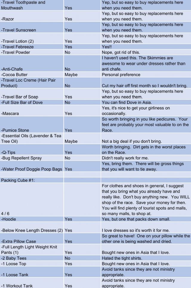 Definitely, DO NOT buy any new clothes or shoes, especially if you are going through Asia. I bought clothes based on the WR dress code and based on the situations I expected to be in during the race. The problem is that most of the things I bought sounded great on paper, but were not necessarily comfortable or didn’t make me feel girly or really didn’t meet my needs in general. I honestly wish I would have made the best of the clothes I had at home and saved my money to shop on the Race.