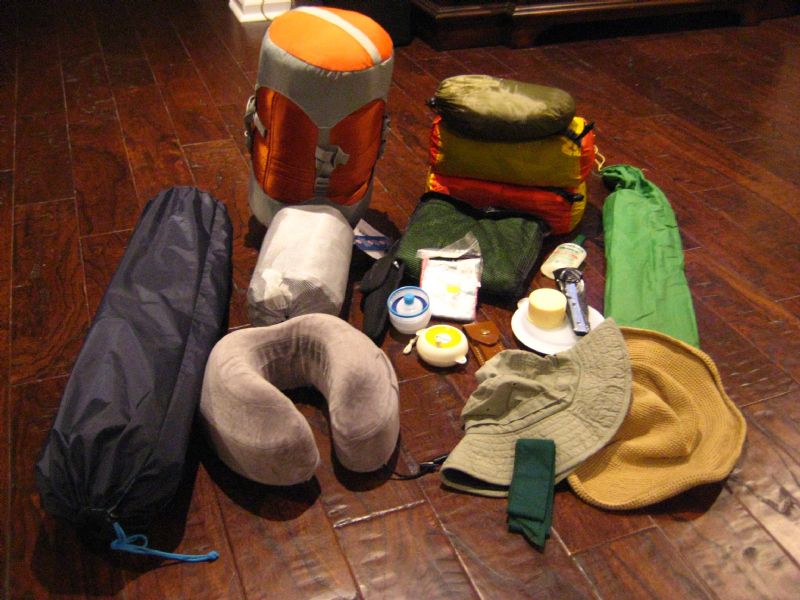 On the left is my gear. Sleeping bag in the orange compression sack in back, tent in the neon rectangular bags, random gear in the middle, and a couple of big dumb floppy hats in front. Still need to pick a sleep mat that is why there are two in the photo.