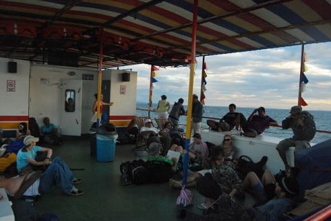 Get on the ferry boat and realize it is quite rocky but have hope that it will