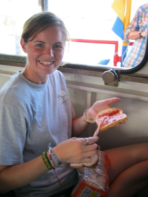 Lindsay and I start to make jelly and banana sandwiches, using candy canes to