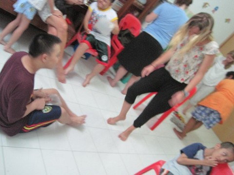 To the left- I am an expert sweeper. To the right- you will see Weng Liang. This kid will melt your heart if he doesn’t kill you with laughter. He performs interpretive dance routines for us and sometimes plays a drum beat so we can have a turn. One day he jumped impressively high during a twirl and fell hard on his ankle which resulted in a doctor’s visit the next day. With his dancing limited, due to injury, he sat on the floor and danced moving only his arms and head. Thank you, Weng Liang.