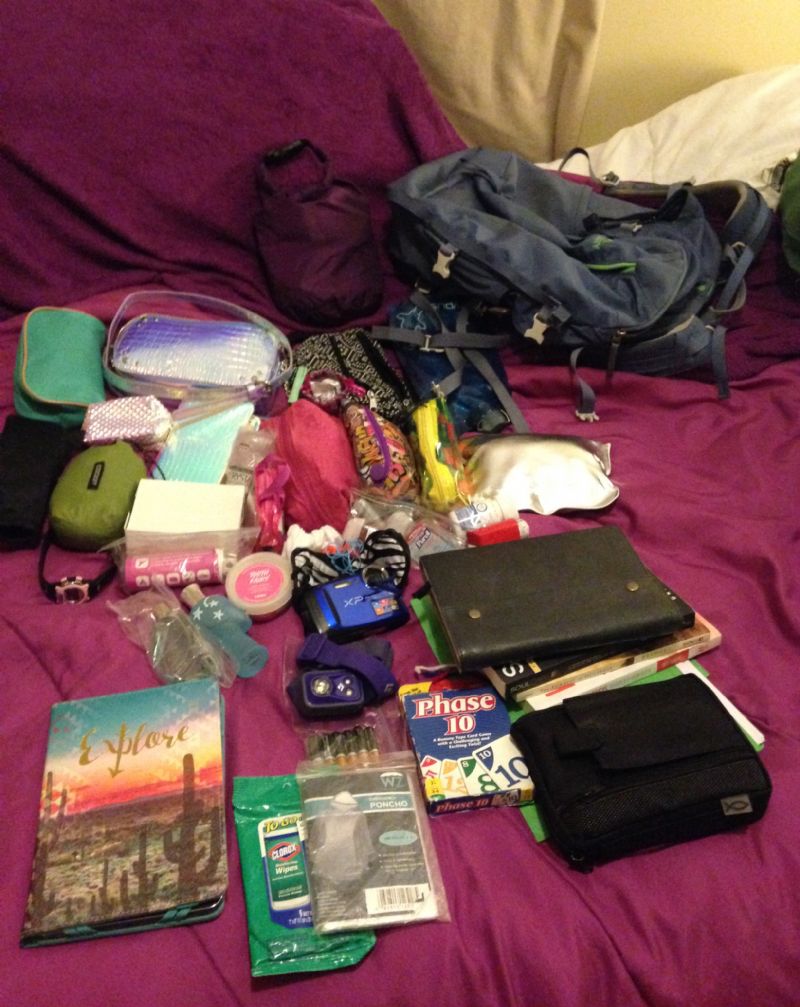 Hook scale for weighing bags, Mosquito net, laundry detergent, dryer sheets, febreeze, “real” pillow, water purifying tabs, hammock, solar powered charger, computer and hard drive, hairspray dryer or straightener, jeans, snacks, plate