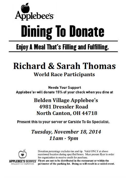 Mark your calendars for Tuesday, November 18, 2014.  We will be having a fundraising event at Applebee’s in Belden Village (North Canton, OH).  Please come and invite all of your friends.  For those patrons that bring in the flyer featured below, Applebee’s will donate 15% of the profit from your meal towards our trip.