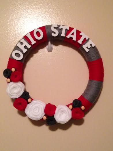 Y6) OSU Wreath Medium: foam wreath, yarn, felt, wooden lettering, paint, buckeye beads