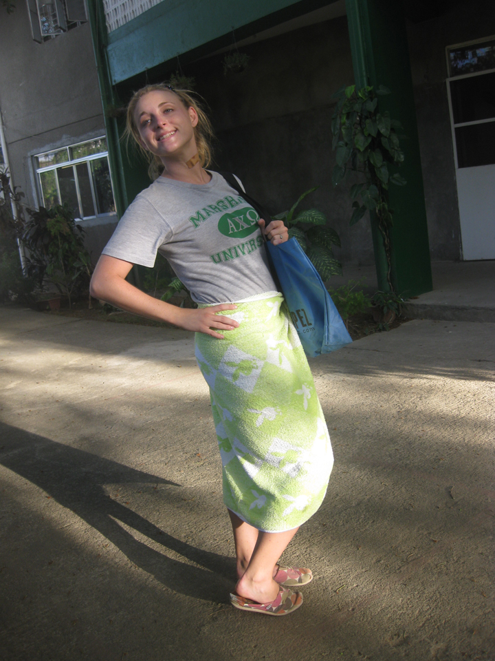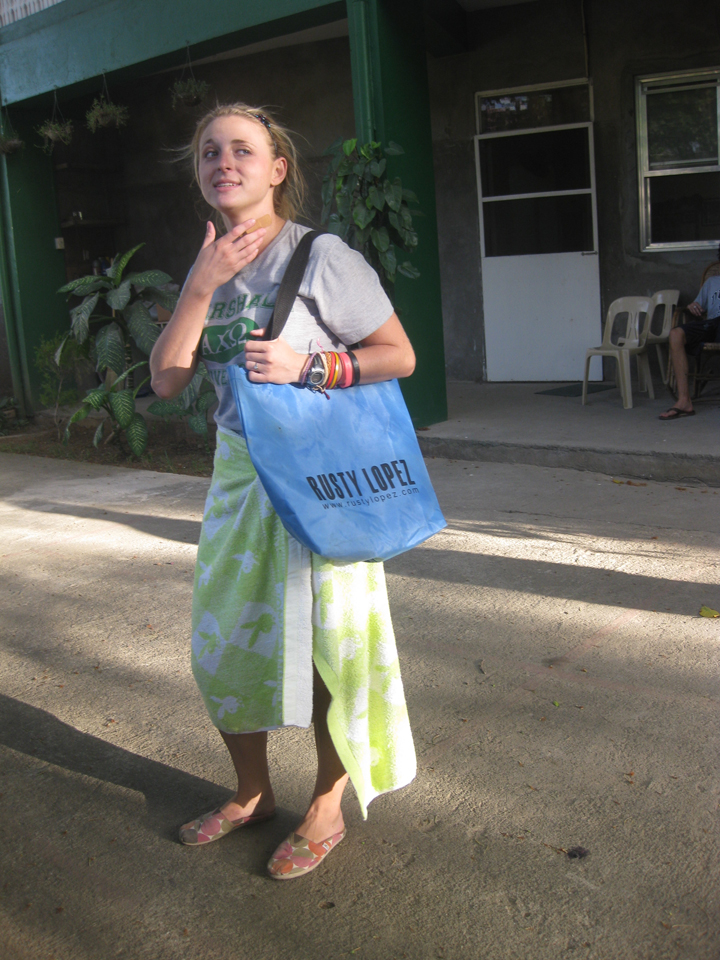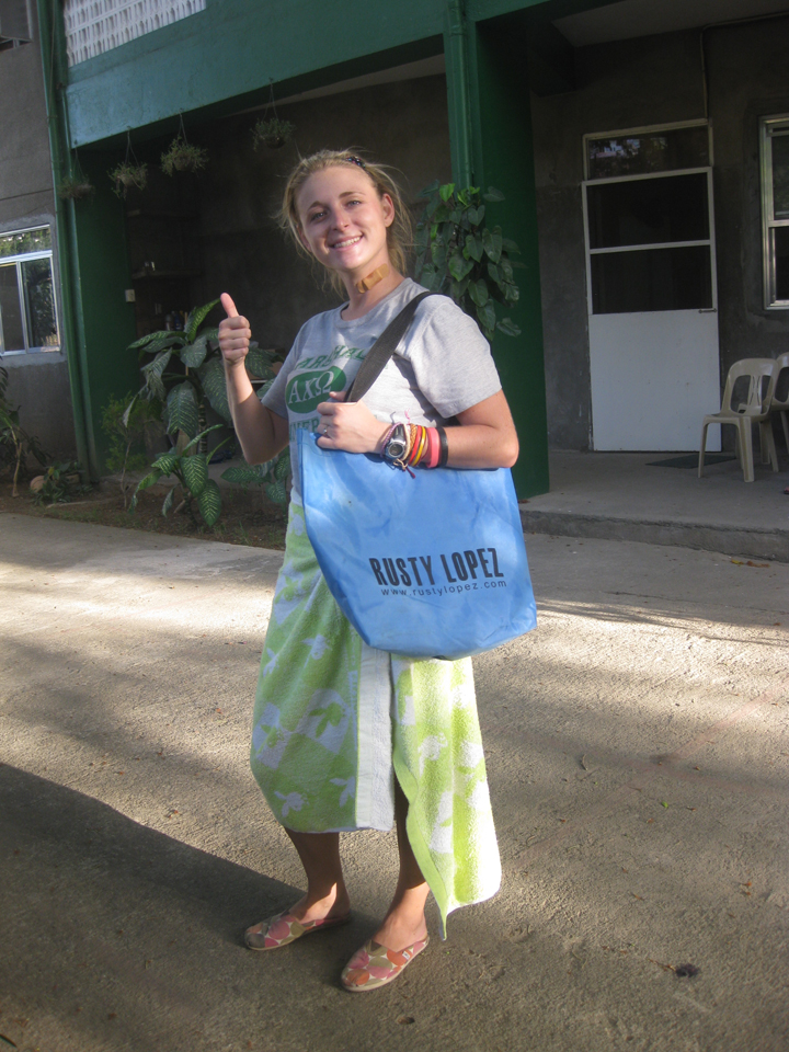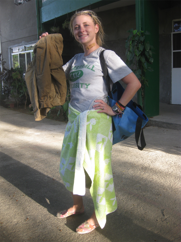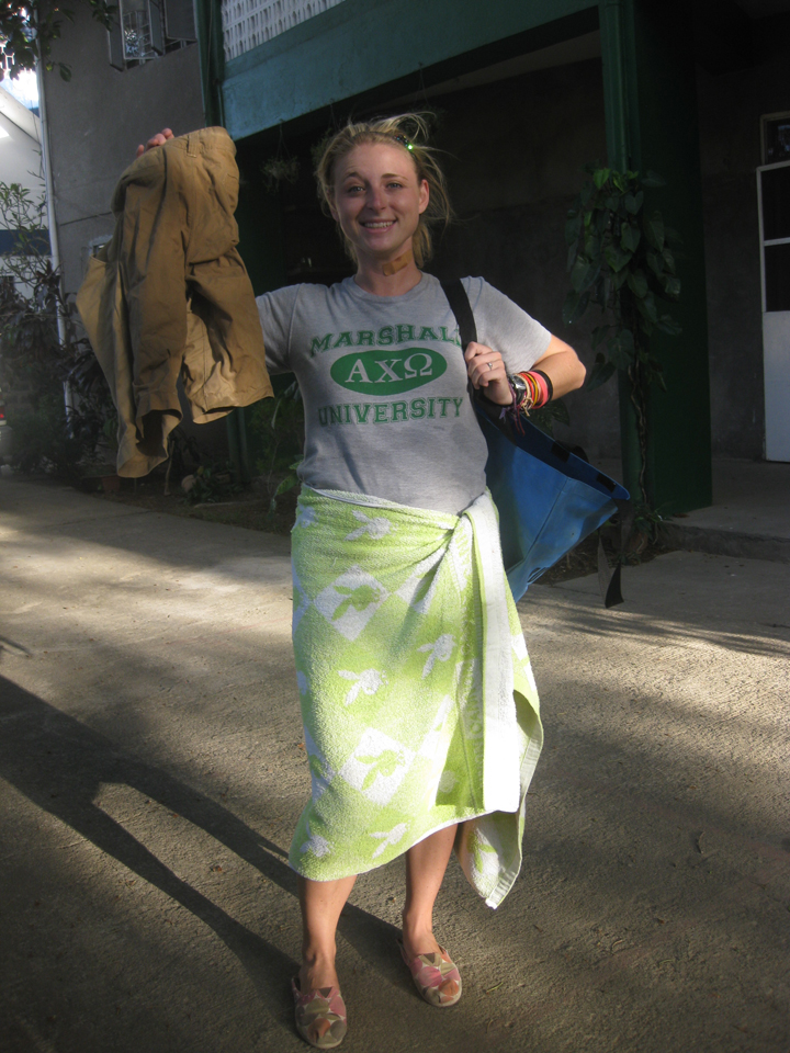 Shortly after passing out, I woke right back up in Hope’s arms lying on the ground. Erin was in front of me with water and some candy while a lady from the village was plugging a fan up to help me get some air. I was soaked in sweat when I woke up and then I realized and I quote directly, I was like “Oh oh and I pee’d my pants…seriously?” Well, that has never happened before but I went with it and definitely had a lot of laughs lol!! So, I’m not sure if you can get the picture at this point but I am lying lifeless in Hope’s arms in the middle of a small village of people soaking wet with my own sweat and pee all over me. It’s at least a thousand degrees outside and there is no air circulating anywhere and the hundreds of kids standing around did not help the matter either. I could not stop laughing at this point just thinking about what had just happened or how I had even gotten to that point. All I could say was “Well, ok God! I guess I asked for the unexpected in my life but I didn’t exactly think this kind of sense of humor was what you had in mind…lol!” I finally gather the strength to stand back up and the same lady from the village who brought me the fan had brought me a towel to wrap around my waist and a bag to carry all of my stuff home in. So, I stripped down into just a towel, a neon green playboy bunny towel might I add, and went on my merry way back to the homestead!!
