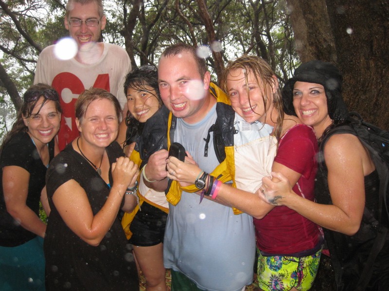 A group of us at Noosa Beach with Fran and Jamie in the pouring rain.